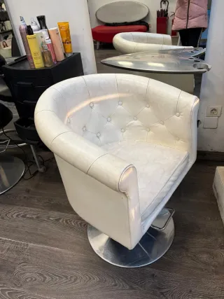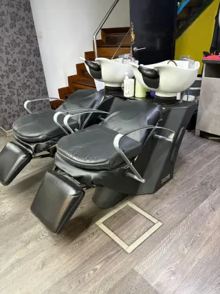 Conjunto de mobiliario profesional para salón de peluquería. - Dos lavacabezas con asientos reclinables. - Cinco sillas de peluquería.