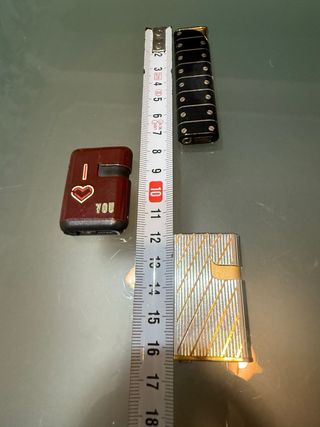 Mechero de gasolina antiguo con un diseño de líneas rojas, negras y doradas. - Diseño a cuadros. - Mecanismo de gasolina. Le falta el tapón de la gasolina