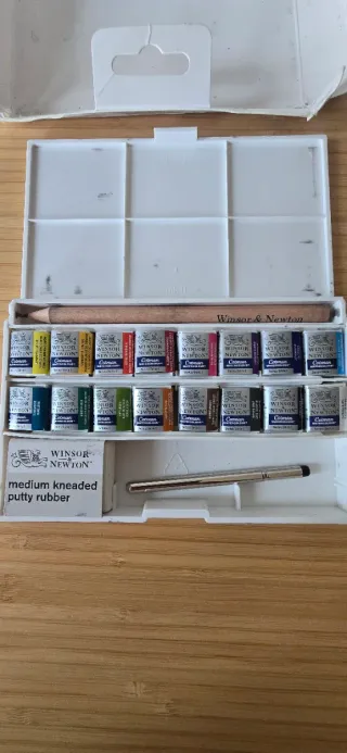 Set de acuarelas Winsor & Newton Cotman. - Incluye 12 tubos de acuarela. - Incluye un lápiz de grafito. - Incluye goma de borrar kneaded. - Incluye un bolígrafo.