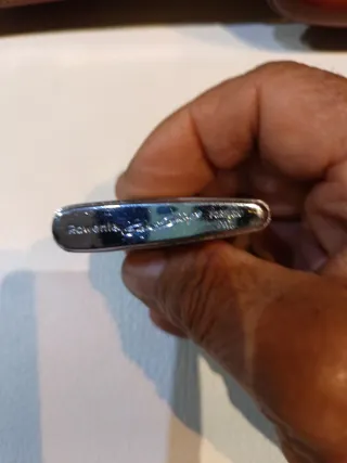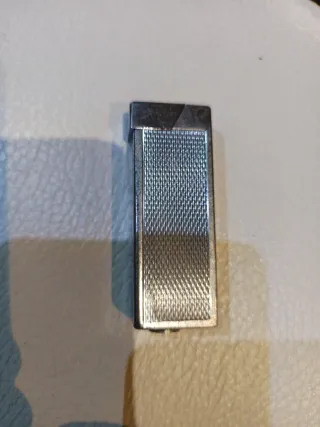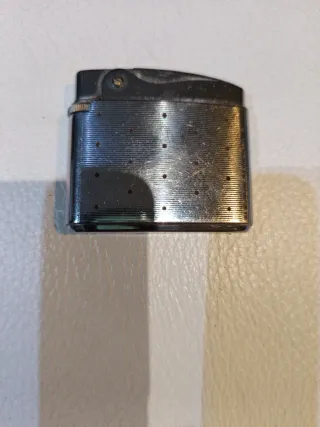 Mechero de gas vintage de la marca Rowenta. Un clásico con un diseño distintivo. - Cuerpo metálico con acabado plateado. - Patrón de líneas finas y pequeños puntos. - Mecanismo de encendido visible.