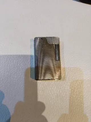 Mechero de gas antiguo con un diseño clásico y elegante. - Acabado metálico plateado. - Patrón de líneas grabadas en la superficie. Marca Chateau