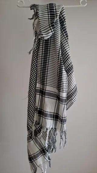 Pañuelo con diseño a cuadros en blanco y negro. Presenta flecos en los extremos. - Diseño a cuadros. - Flecos decorativos. - 100x110cm