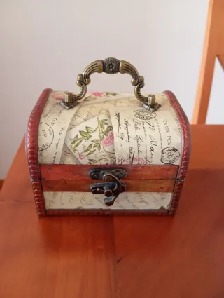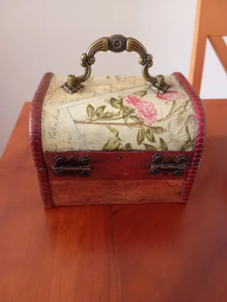 Pequeño joyero con un diseño inspirado en baúles antiguos. - Decoración con motivos florales y caligrafía. - Asa metálica dorada. - Cierre de gancho. - Medidas: 12 cm ancho 8,5 cm alto 9,5 cm fondo