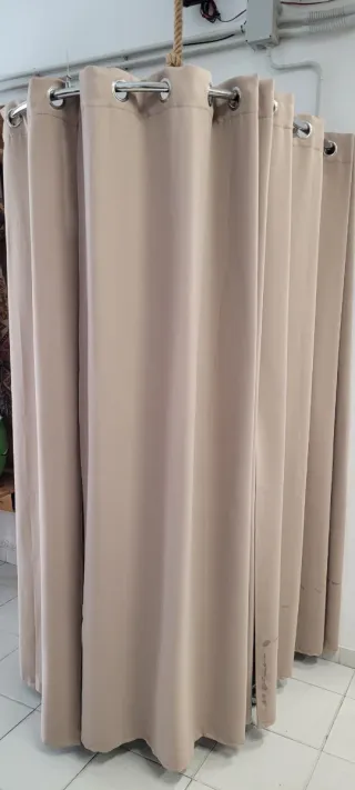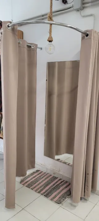 Este probador completo incluye 3 cortinas de color beige y estructura metálica. - 3 Cortinas de tela inifugas - Ojales metálicos en las cortinas. - Estructura de soporte. - Cuerda para colgar. Una de las cortinas tiene una mancha debajo: se ve en la tercer foto Comprado en RETIF. Nuevo cuesta 111 cada cortina y 65 el probador haciendo un total de 398€