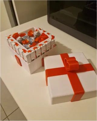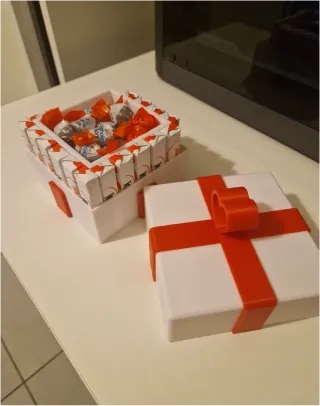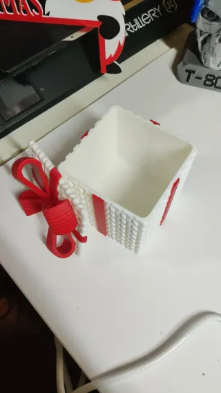 Bonita caja con diseño de regalo, perfecta para la temporada navideña o celebración especial. Su textura imita un tejido de punto. - Diseño de lazo y cintas en relieve. - Acabado blanco con detalles rojos, puedes elegir los colores que más te gusten. - Ideal para rellenar de chuches o un detalle especial. - Posibilidad de elegir el tamaño. - Se realiza en impresión 3d completamente personalizada y a tu gusto. Para cualquier duda pregunta sin compromiso.