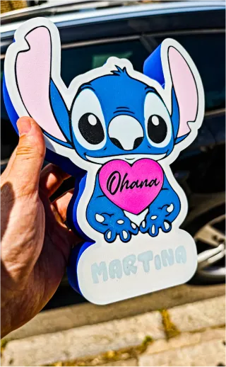 Figura decorativa de Lilo & Stitch con la palabra Ohana en el corazón y personalizable con un nombre. - Diseño de Lilo & Stitch. - Corazón rosa con Ohana. - Base para nombre personalizado (ej. MARTINA). - Contorno azul y blanco.