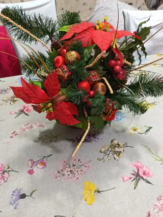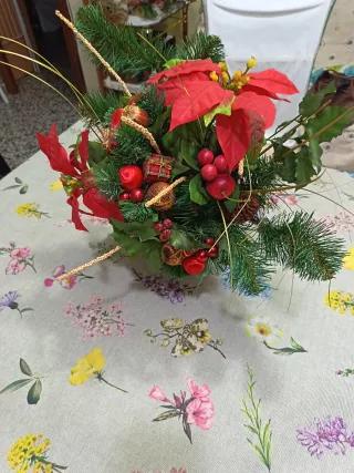 Precioso centro de mesa decorativo para la temporada navideña. Ideal para dar un toque festivo a tu hogar. - Incluye flores de pascua rojas. - Adornado con piñas y esferas doradas. - Ramas de pino artificiales. - Pequeños regalos decorativos.