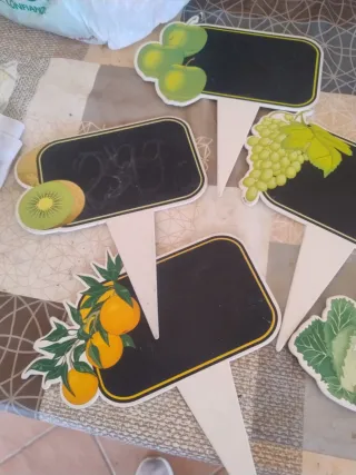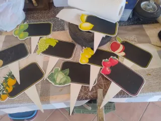 Set de carteles decorativos con motivos de frutas y verduras, perfectos para dar un toque original a tus espacios. 9 CARTELES EN TOTAL. TAMAÑO DE LA PIZARRA 15×9 cm - Diseño de limones. - Diseño de uvas. - Diseño de peras. - Diseño de manzanas. - Diseño de fresas. - Diseño de naranjas. - Diseño de aceitunas. - Diseño de col.