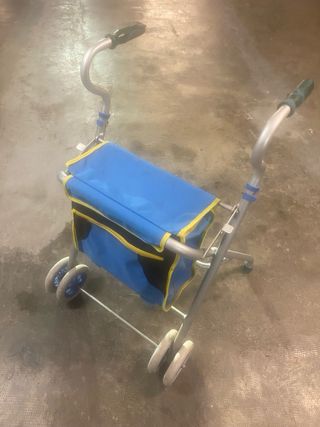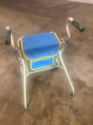 Andador ligero y plegable, ideal para facilitar la movilidad. Cuenta con un práctico bolso para llevar tus pertenencias. - Fabricado en aluminio. - Bolso de tela azul con ribetes amarillos. - Empuñaduras ergonómicas.
