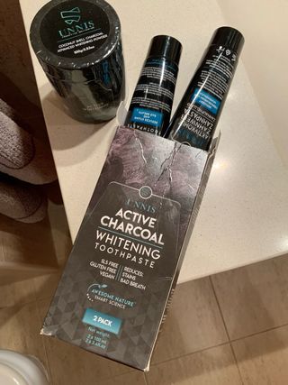 Pack de dos pastas de dientes UNNIS Active Charcoal Whitening Toothpaste. + Blanqueante Carbon Activo Coco Polvo Blanqueamiento Dental Activated (100 g - Fórmula SLS Free, Gluten Free y Vegana. - Reduce manchas y mal aliento. - Contenido: 2 x 100 ml (2 x 3.4 fl.oz).