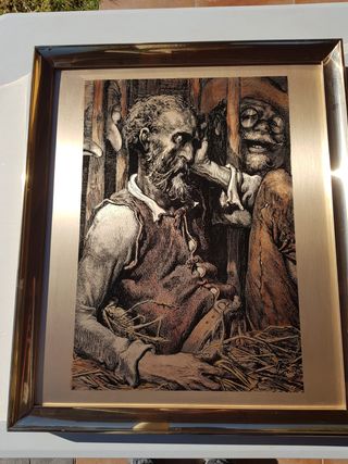 Grabados sobre plancha del Quijote del ilustrador francés Doré, enmarcadas y pintadas a mano posteriormente. Medidas son 65x55cm, con imágenes (54x36cm) de El Quijote de Cervantes: Don Quijote y la princesa Micomicoma, y Don Quijote dentro de la jaula.