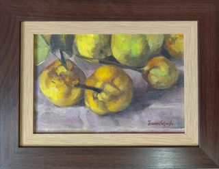 Serie de 4 bodegones de Vicente Traver Calzada. 4 óleos sobre lienzo: Granadas (55x40cm) - 900€ Plátanos (68x48cm) - 900€ Membrillos (54x28cm) - 900€ Membrillos pequeños (40x30cm) - 600€ intor, escultor, grabador y retratista valenciano (Burriana, 1945), discípulo de Ramón Catalán y con estudios de Bellas Artes en Castellón, Valencia, Madrid, París y Roma. Su obra refleja un trabajo minucioso, meticuloso, minorista, casi obsesionado por la perfección. Figurista y realista, el autor utiliza el hiperrealismo para criticar sus desmanes y mostrar el sentido del abstracto.
