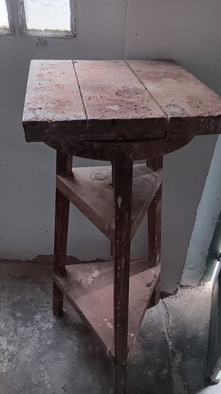 Mesa giratoria de cerámica antigua. Ideal para taller de cerámica u otras manualidades. - Estructura de madera robusta. - Tres niveles de apoyo. - Superficie de trabajo cuadrada. - Presenta señales de uso y desgaste, lo que le da un encanto rústico.
