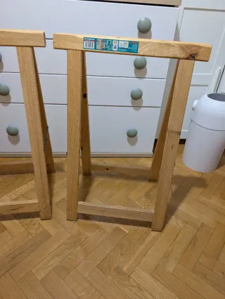 2 caballetes de madera de pino natural. 75cm altura, de Leroy Merlín Las especificaciones pueden verse en la web de la tienda, el modelo es "Caballete de pino madera natural y altura 75 cm" También tengo un tablero para poner encima y hacer una mesa