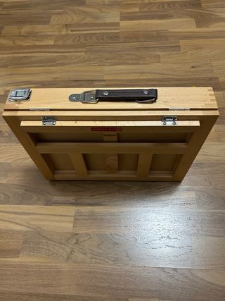 Caballete o atril de mesa en madera. Se puede cerrar para transportar con asa. Tenía un cajón donde guardar el material, pero se perdio., de ahí su precio