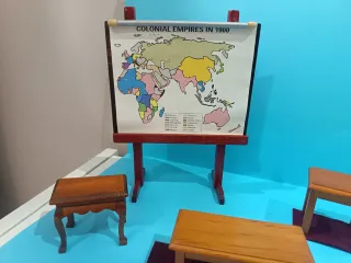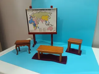 Conjunto de piezas para casa de muñecas, ideal para coleccionistas o para crear un diorama. - Incluye un mapa de Colonial Empires in 1900 en un caballete. - Varias mesas pequeñas de madera. - Diseño detallado y realista.