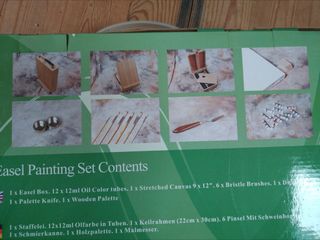 Nuevo, nunca se ha usado. Maletín de madera que contiene: - caja caballete - 12 tubos de 12 ml de pintura oleo - 6 pinceles - aceitera - 1 lienzo de 22*30 cm - 1 espátula - 1 paleta