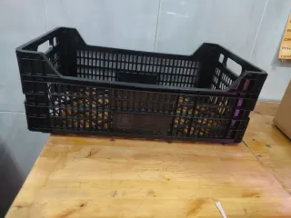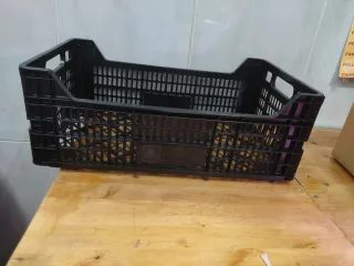 Caja de plástico resistente, ideal para el transporte y almacenamiento de frutas. - Material: Plástico. - Color: Negro. - Diseño: Rejilla para ventilación.