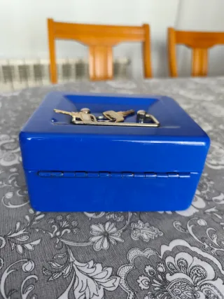 Caja fuerte de color azul, perfecta para guardar monedas, billetes y objetos de valor con 6 separadores para monedas Está en perfectas condiciones - Incluye dos llaves. - Diseño compacto y seguro. ⚡Precio negociable⚡
