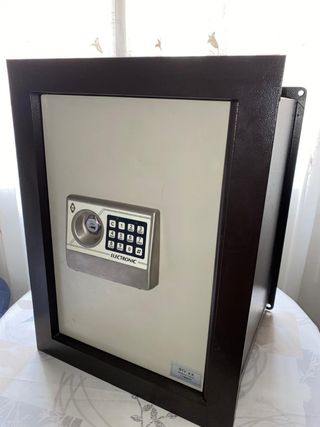 Caja fuerte digital de la marca BTV. Diseñada para proteger tus objetos de valor. - Panel numérico electrónico. - Cerradura de seguridad. - Acabado en color gris y marco marrón. - Medidas aprox. 36 cm ancho x 31 profundidad x 49 alto + 3 cm de marco. Se puede empotrar en pared. Como nueva. Alta gama.