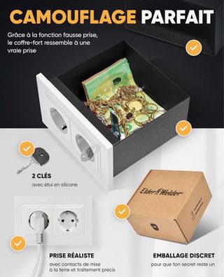 Caja fuerte con diseño de enchufe para un camuflaje perfecto. Incluye dos llaves con funda de silicona y viene en un embalaje discreto. - Diseño realista de enchufe doble. - Incluye 2 llaves con estuche de silicona. - Embalaje discreto para mantener tu secreto. - Envío a toda España.