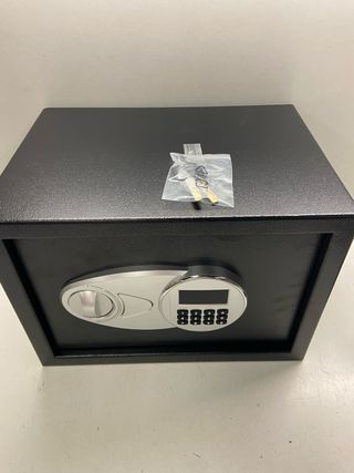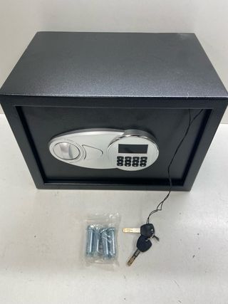 Caja fuerte de seguridad con cerradura digital y llave de emergencia. - Panel frontal con teclado numérico. - Diseño robusto y discreto.