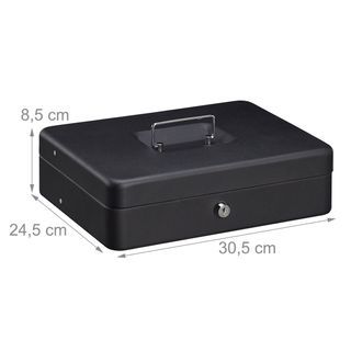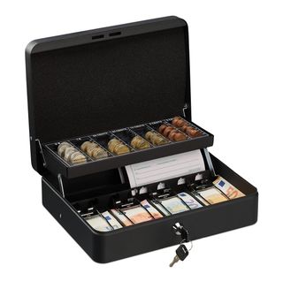 Caja recaudadora de dinero con cerradura de seguridad y 2 llaves. Disponible en color negro Con bandeja para monedas y 4 espacios para billetes para clasificarlos fácilmente Se puede utilizar como caja fuerte para el hogar o caja registradora en clubs y eventos Mide: 8,5x30,5x24,5 cm Práctica caja de caudales con asa de transporte para facilitar el transporte. Para llevar Tiene un pequeño golpe casi imperceptible en el exterior y algun rayon en el interior en la zona de la cerradura #3281