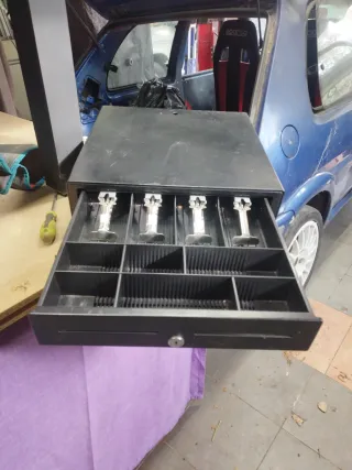 Caja registradora de color negro, con compartimentos para billetes y monedas. - Cerradura con llave incluida. - Bandeja interior con divisiones. - Le falta el cajetín de monedas