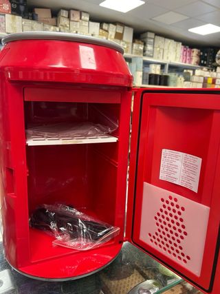 Mini nevera eléctrica portátil “Cold Drinks”, diseño original en forma de lata roja, muy decorativa y funcional. Características: • Funciona a 230V (cable incluido) y 12V para coche • Puerta frontal con balda interior • Interruptor ON/OFF • Ideal para bebidas, latas, snacks, cosmética o uso decorativo • Diseño llamativo tipo vintage / Coca-Cola style