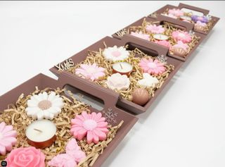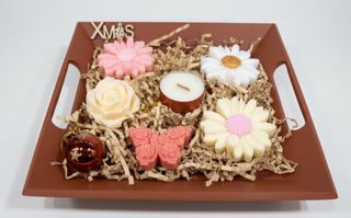 Bandeja decorativa con varios jabones artesanales y un portavelas. - Jabones con formas de flores, mariposas y rosa. - Incluye un portavelas y decoración navideña. - Decoración con virutas de papel marrón o verde. #jabónartesanal #regalonavidad #bandejaregalo #regaloeconómico #navidad #regaloreyes #jabónpersonalizado #regalopersonalizado #jabónaromático
