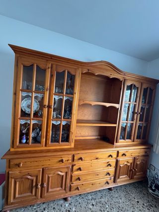 Aparador/bufet con cajones y puertas para almacenamiento. Vitrina con puertas de cristal para exhibir vajilla, copas o decoración. Estilo clásico/rústico, chapado en madera. 2,44 largo; 2 metros ancho.