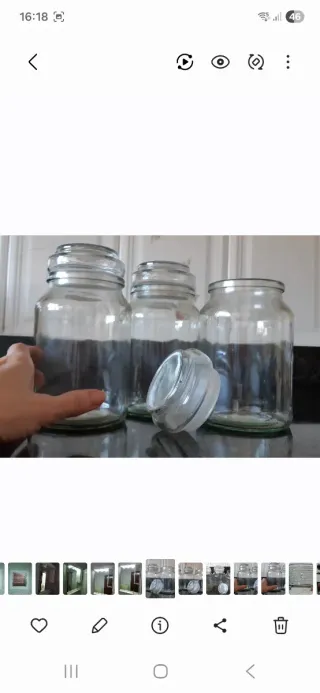 Conjunto de tres botes de cristal de gran tamaño, con tapa. Son ideales para almacenar alimentos o cualquier otro objeto. - Material: Cristal. - Cantidad: 3 unidades. - Miden 17cm alto aprox. Tengo 2 lotes (6botes)