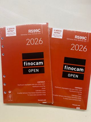 Recambio de agenda Finocam R599C para el año 2026, con formato Semana Vista Vertical 500. Incluye 6 meses extra. 11,5x18cm - Planificación desplegable de los años 2026 y 2027. - Planificación anual fija. - Horario. - Calendario de 4 años. - Anualidad Semana Vista (Enero-Diciembre 2026). - 6 meses extra Quinzena Vista. - Idioma: Catalán. Se pueden comprar tanto juntas como separadas.