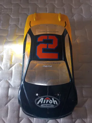 Carcasa de coche radiocontrol con diseño deportivo. - Color amarillo y negro. - Número 2 en grande. - Logo de Airoh. - Diseño inspirado en Mazda.