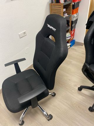 Silla de escritorio ergonómica con diseño deportivo. - Tapicería de tela negra. - Base metálica con ruedas. - Reposabrazos. - Logo de la marca TEMPEST en el respaldo. Esta casi nueva solo una rueda esta doblada pero aun asi se mueve bien, por eso ese precio