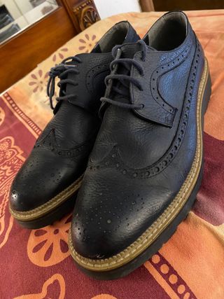 Elegantes zapatos de vestir de piel en color azul. Talla 44 - Diseño clásico con cordones. - Detalle de picado tipo wingtip. - Suela gruesa y resistente.