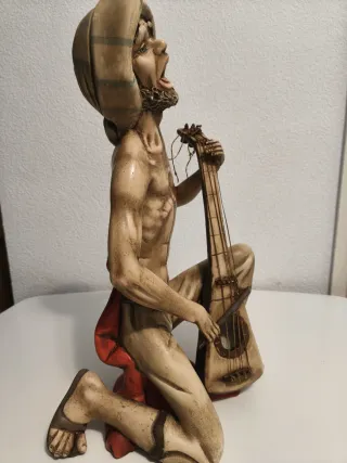 Figura decorativa de cerámica con un músico tocando un instrumento de cuerda. - Diseño detallado y expresivo. - Tonos tierra y ocres predominantes. - Base estable para exhibición. Magnífica escultura de bulto redondo realizada en cerámica policromada a mano. Manufacturada por Cerámicas Franju. Fecha de fabricación: 1950-1960 Representa un árabe con turbante y calzón tañendo un instrumento de cuerda y cantando. Su gran expresividad y carácter, unidos a unas notables dimensiones, convierten a esta escultura en una pieza realmente imponente.