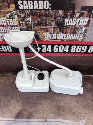 Lavabo portátil con dos depósitos, uno para agua limpia y otro para aguas residuales. Ideal para exteriores o lugares sin acceso a agua corriente. - Estructura blanca de plástico resistente. - Grifo integrado. - Bomba de pie para el agua. - Manguera corrugada para conexión.