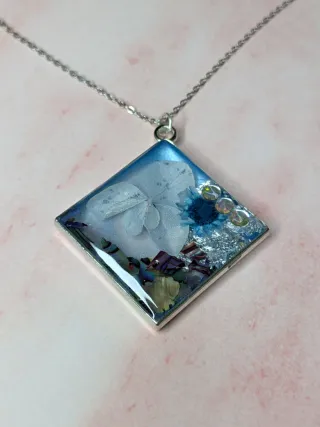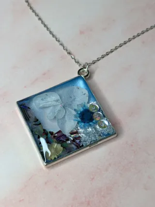 ✨ Colgante artesanal de resina – pieza única ✨ Colgante hecho a mano en resina, con un delicado diseño floral en tonos azules. Incluye una flor natural preservada, detalles iridiscentes y pequeños cristales decorativos que reflejan la luz de forma muy elegante. Cada pieza es única, no hay dos iguales. 🔹 Materiales: resina artesanal, flor natural, base metálica 🔹 Color: azul con detalles nacarados y plateados 🔹 Forma: cuadrada (colocada en forma de rombo) 🔹 Cadena incluida (color plateado) 🔹 Estado: nuevo, sin uso Ideal como regalo especial o para dar un toque original y delicado a cualquier look.
