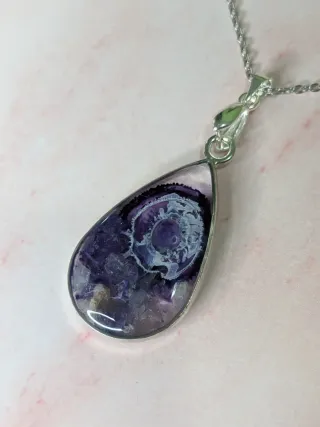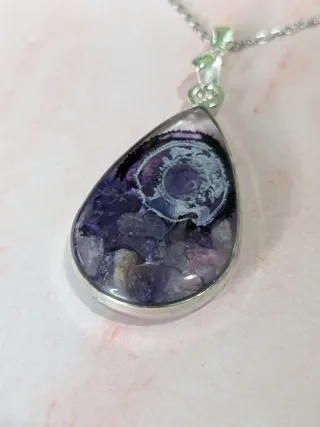 Colgante artesanal de resina ✨ Pieza única hecha a mano, con piedras naturales y un delicado efecto en espiral en tonos violetas y lavanda, que evocan calma y profundidad. Su forma de gota lo hace elegante y muy favorecedor. Incluye cadena de acero inoxidable o cordón negro (a elegir). Precio: 20 € 💫