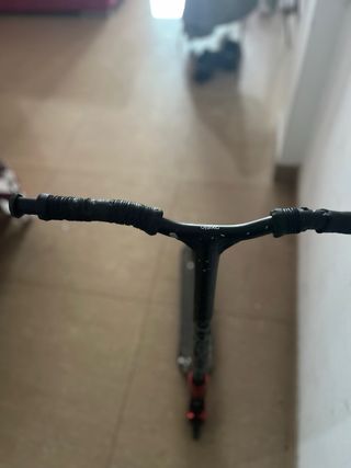 Patinete de estilo libre con un diseño llamativo. - Manillar negro. - Base y horquilla negras. - Detalles en color rojo.