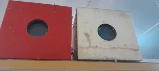 Cajones educadores para pájaros. - Fabricados en madera. - Color rojo y blanco. - Con orificio circular.