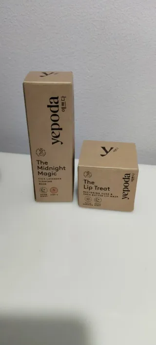 Set de dos productos de cuidado facial de Yepoda. NUEVOS SIN ABRIR - The Midnight Magic Sleeping Mask con Cica y Lavanda. 20ml - The Lip Treat con Yuza y Manteca de Karité. 15g De regalo the spf bff 50 estrenada