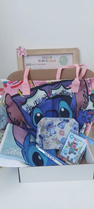 Caja temática de Stitch con varios artículos. - Totebag con cremallera de Stitch. - Neceser pequeño. - Mini toalla Stitch. - Mini libreta con boli. Lápiz. - Gloss - Regalo pegatinas
