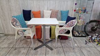 9 mesas y 13 sillas con brazo y 5 sillas sin brazo Todo en perfecto estado las mesas a 30 euros cada una y las sillas a 10 euros cada una