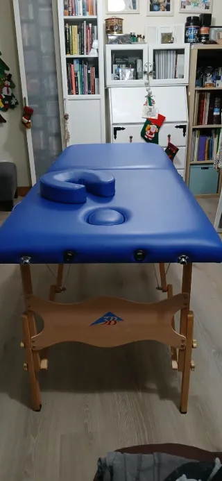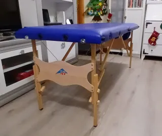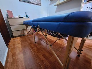 Camilla de masaje[68×190] acolchada de 6 patas de madera de haya de alta calidad con tacos antideslizantes ,incorpora patas centrales para ofrecer mayor resistencia, soportando hasta 250 kg, con 2 agujeros faciales y doble respaldo. Se regula en altura. Es súper estable. El recubrimiento de la espuma es ignífugo, de alta calidad y resistente a bacterias y hongos. Los tensores están confeccionados en acero trenzado y recubiertos con ABS, un material que protege contra la corrosión. La vendo junto al carrito y funda para transportarla si haces trabajos a domicilio. Por las esquinas está un poco arañada de transportarla.
