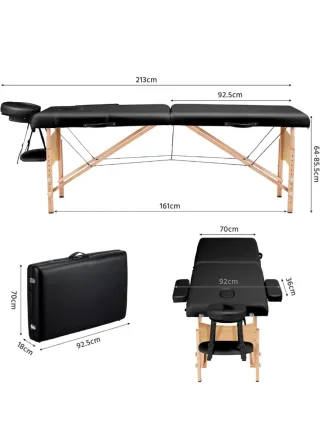 Camilla de masaje negra, ideal para tratamientos de belleza o fisioterapia. Es plegable y fácil de transportar. - Estructura de madera. - Acolchado de espuma. - Reposacabezas ajustable.