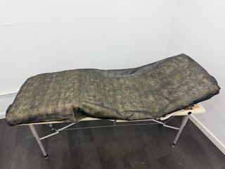 Camilla de masajes negra, ideal para tratamientos de belleza o terapias. - Estructura de madera. - Superficie acolchada y resistente. - Diseño plegable para fácil transporte y almacenamiento.