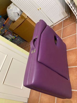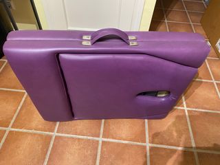 Camilla de masajes profesional de color púrpura. Es plegable y cuenta con un asa para facilitar su transporte. - Diseño ergonómico. - Acolchado cómodo. - Orificio facial integrado.