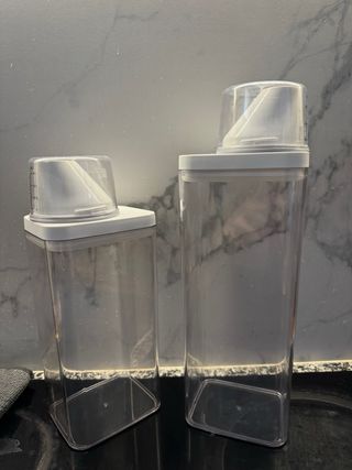 botes transparentes para almacenar detergente. Cada bote incluye un medidor integrado en la tapa. - Material: Plástico transparente. - Diseño cuadrado y apilable. - Tapa con medidor (ml y cups). - Tamaño L capacidad de 1,5l - Tamaño XL capacidad de aproximadamente 2L (hay 2 unidades) SE PUEDEN VENDER X SEPARADO